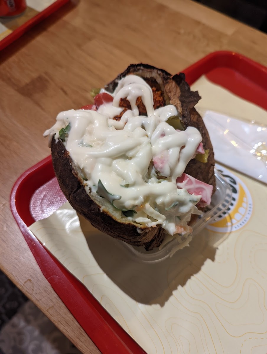 The potatoes were very creamy on the inside, and the toppings were tasty. The size of the potato was good too, filling, but it would have been nice to have a slightly bigger portion of toppings. Upstairs in the restaurant it was very hot, which was a bit annoying. Also, I would have appreciated if there had been labels above the toppings to show what each one was. Overall, though, I liked it and I would go back.